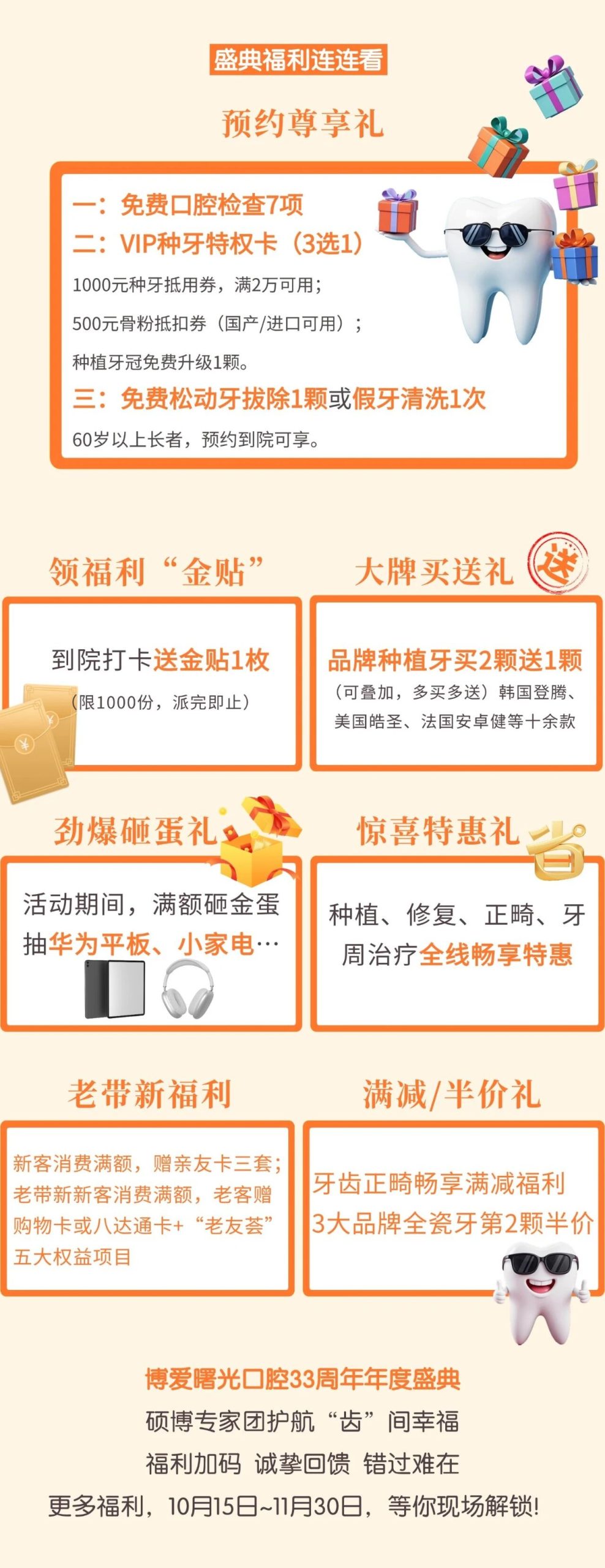 都說一口好牙能抵一輛豪車 然而,因為各種原因 很多人牙齒疏於管理和治療 不僅給生活帶來很多尷尬 更為健康埋下不少隱患 不過,保護牙齒重在防微杜漸! 從口腔問題萌芽期開始關注和治療 越早治療,就越早收穫口福與健康 告別“難以啟齒”的尷尬 讓自己和家人重拾健康與口福 機會來啦! 博愛曙光口腔33周年年度盛典 將於10月15日正式啟幕 無論您有種牙/修復/牙齒矯正/美白各種需求 都可以享受專場福利與品質服務
