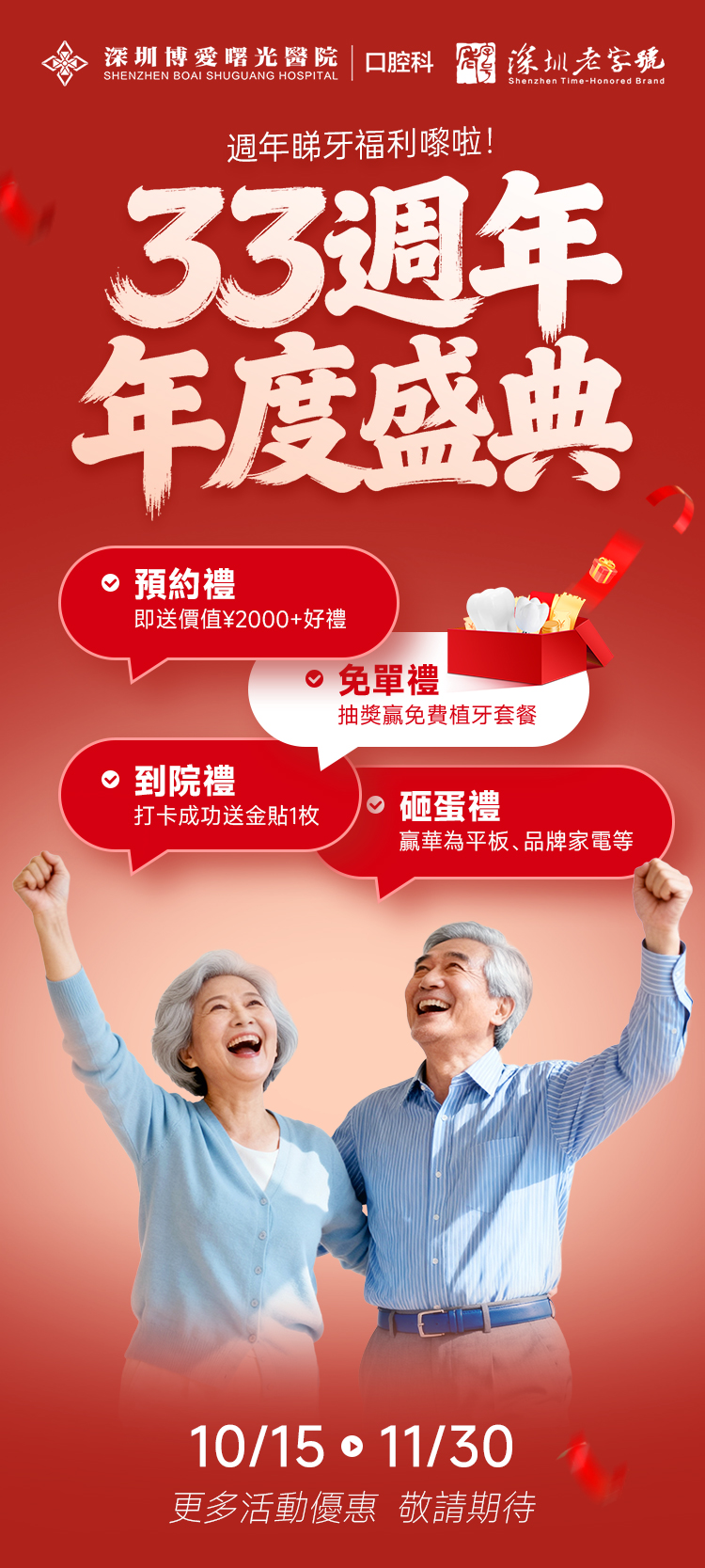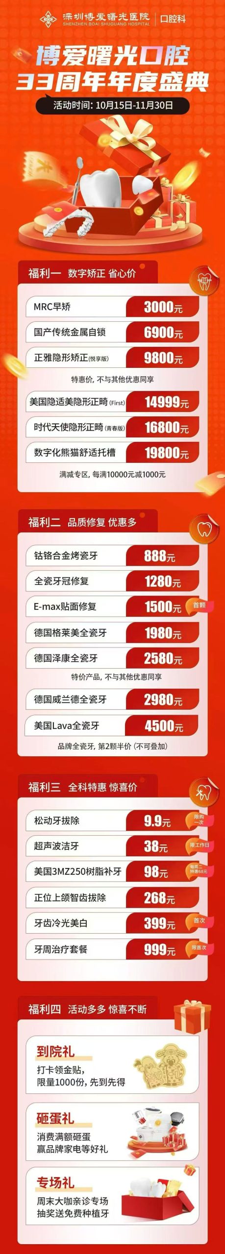 深圳博愛曙光醫院牙科 33周年年度盛典 福利鉅惠正式開啟 活動時間:10月15日-11月30日福利一 數字矯正 省心價 MRC早矯 3000元 國產傳統金屬自鎖 6900元 正雅隱形矯正(悅享版) 9800元 特惠價,不與其他優惠同享 美國隱適美隱形正畸(First) 14999元 時代天使隱形正畸(青春版 16800元 數字化熊貓舒適托槽 19800元 滿減專區,每滿10000元減1000元 福利二 品質修復 優惠多 鈷鉻合金烤瓷牙 888元 全瓷牙冠修復 1280元 E-max貼面修復 1500元 首顆 德國格萊美全瓷牙 1980元 德國澤康全瓷牙 2580元 特價產品,不與其他優惠同享 德國威蘭德全瓷牙 2980元 美國Lava全瓷牙 4500元 品牌全瓷牙,第2顆半價(不可疊加) 福利三 全科特惠 驚喜價 鬆動牙拔除 9.9元 超聲波潔牙 38元 美國3MZ250樹脂補牙 98元 正位上頜智齒拔除 268元 牙齒冷光美白 399元 牙周治療套餐 999元 福利四 活動多多驚喜不斷 到院禮 打卡領金貼, 限量1000份,先到先得 砸蛋禮 消費滿額砸蛋贏品牌家電等好禮 專場禮 周末大咖親診專場抽獎送免費種植牙